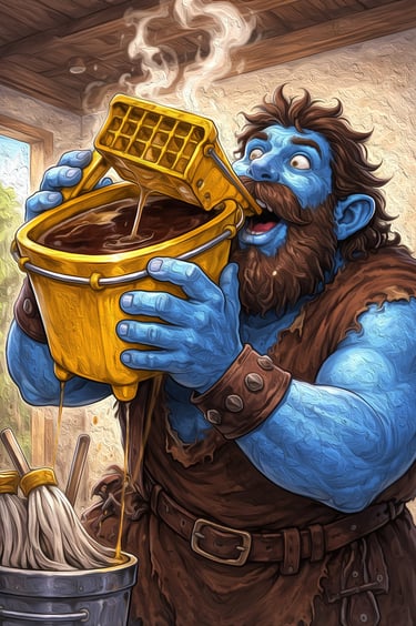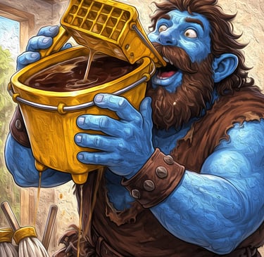 After consuming what Tammy estimated was roughly two gallons of coffee brewed into her mop bucket (which she planned to throw away and never speak of again), Gorgok extracted himself from the coffee shop doorway. He left behind a Gorgok-shaped impression in the frame that would become a minor tourist attraction. Then he resumed his quest.